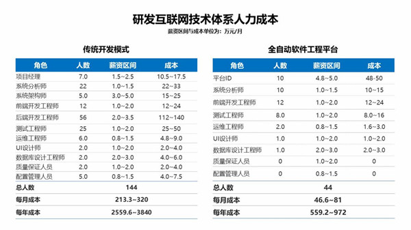 基于上述配置要求,“傳統開發模式”和“飛算全自動軟件工程平臺”兩者人力成本的相關費用對比如下所示: